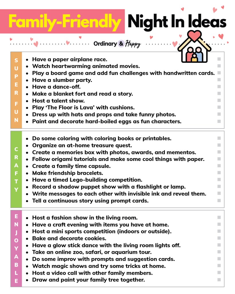 Inspired by a list from Ordinary and Happy, families can turn ordinary evenings into something special with easy, creative activities at home—like movie nights, blanket forts, craft projects, storytelling games, baking together, mini competitions, virtual tours, and treasure hunts.