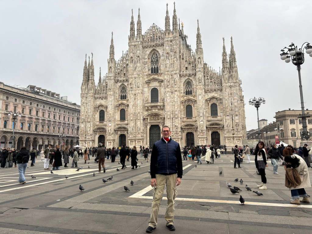 Thanks to a lighter volunteer schedule than expected, Kyle was also able to explore. He spent time in Milan and took a day trip to Turin, host of the 2006 Winter Olympics, where he toured the royal palace and admired the Piedmont region near the mountains. He ventured into Switzerland to ride the famous Bernina “red train” through the Alps, stopping in St. Moritz. In Milan, he visited the breathtaking Milan Cathedral—the iconic Duomo seen so often in Olympic broadcasts. He was struck by its centuries-long construction and the prominent statue of the Virgin Mary atop the cathedral. Milan maintains a tradition of placing additional Virgin Mary statues on other tall buildings so the Duomo remains symbolically dominant in the skyline.