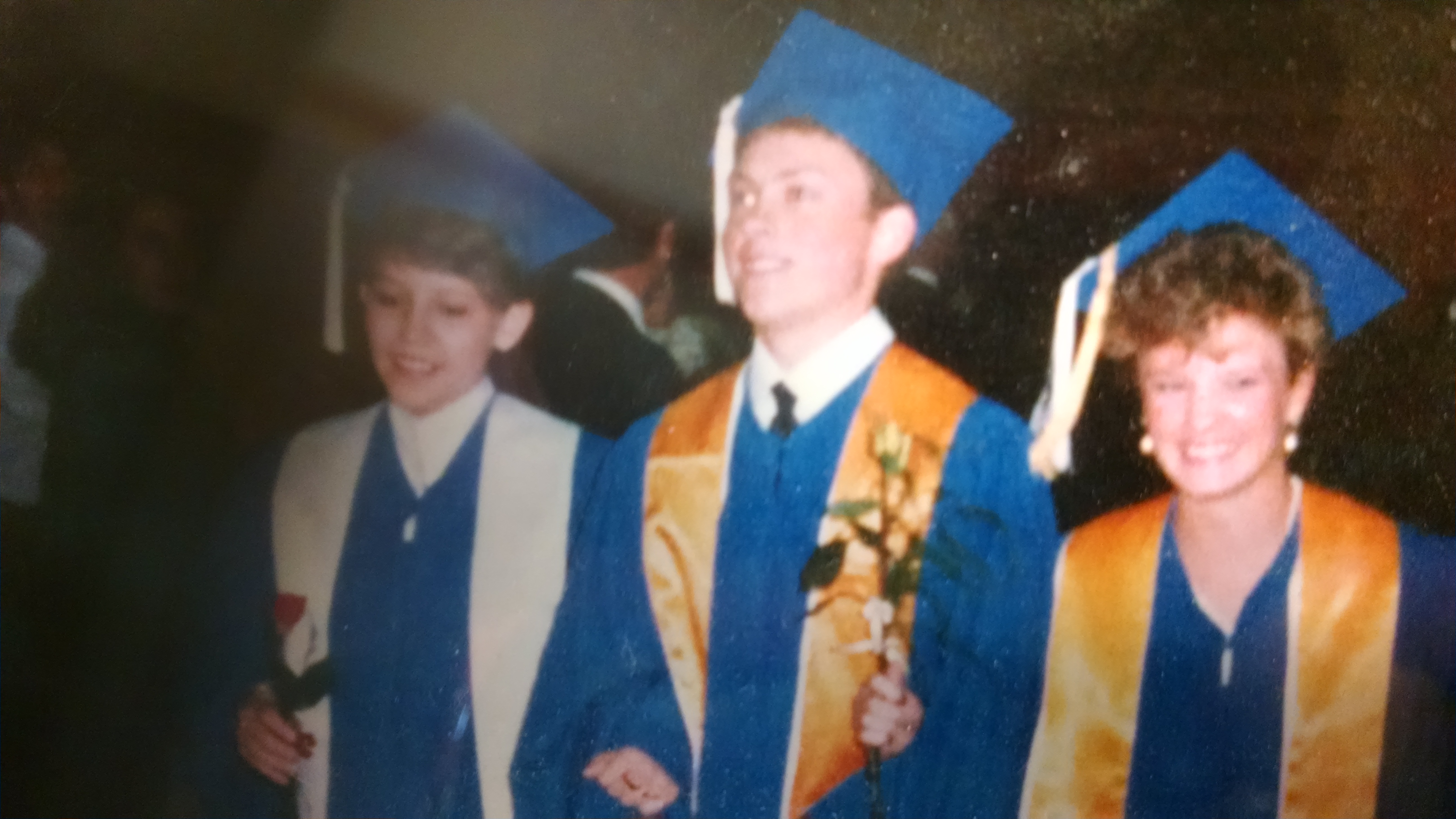 Joe Rinehart graduated in 1987 along with Marcy, but he was NOT in the USA. He graduated from Colegio Nueva Granada in Bogota, Colombia. Here is a picture of Joe and 2 of his friends.