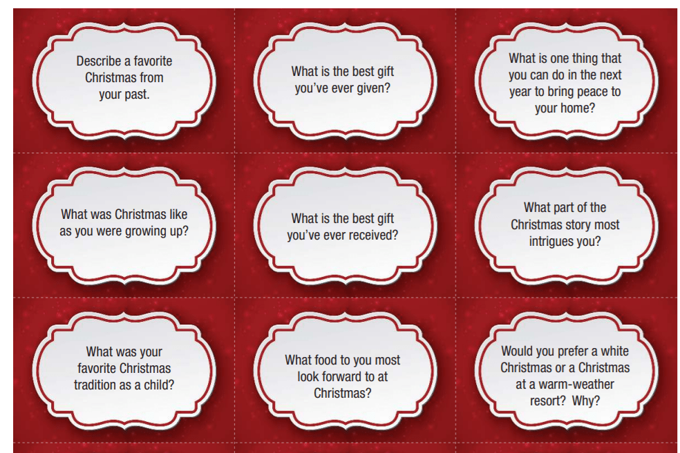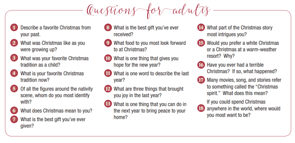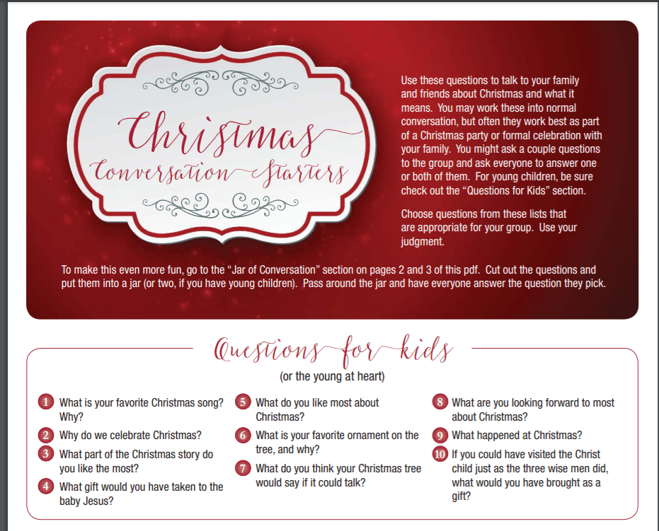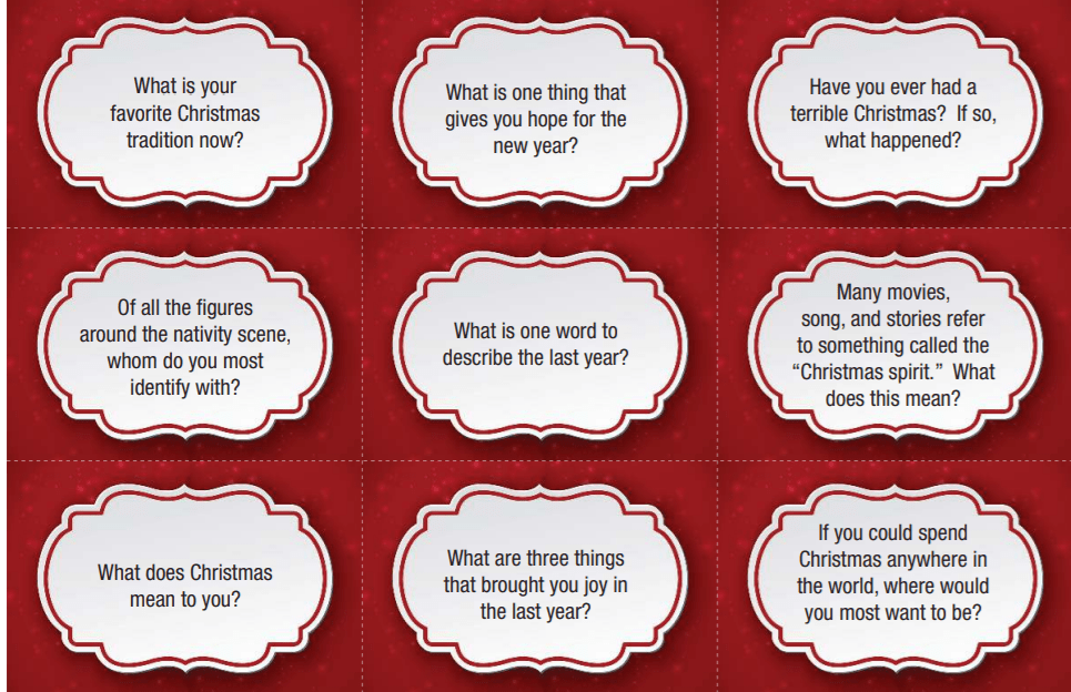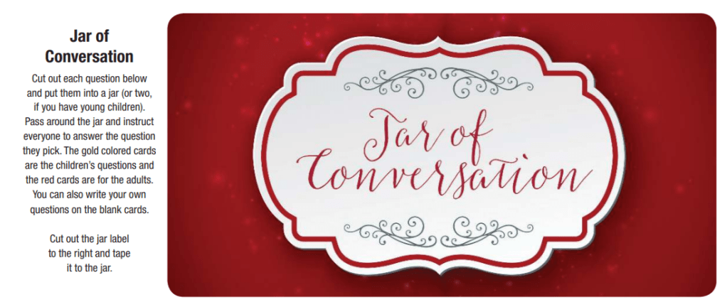 This morning we talked about different questions to use at your family or friend gatherings this holiday season found on family life.com. You can use these questions to talk about the meaning of Christmas and what it means to you. You can also make a jar of conversation and place the questions inside and go around the table and have each person pick and question and share there answers.