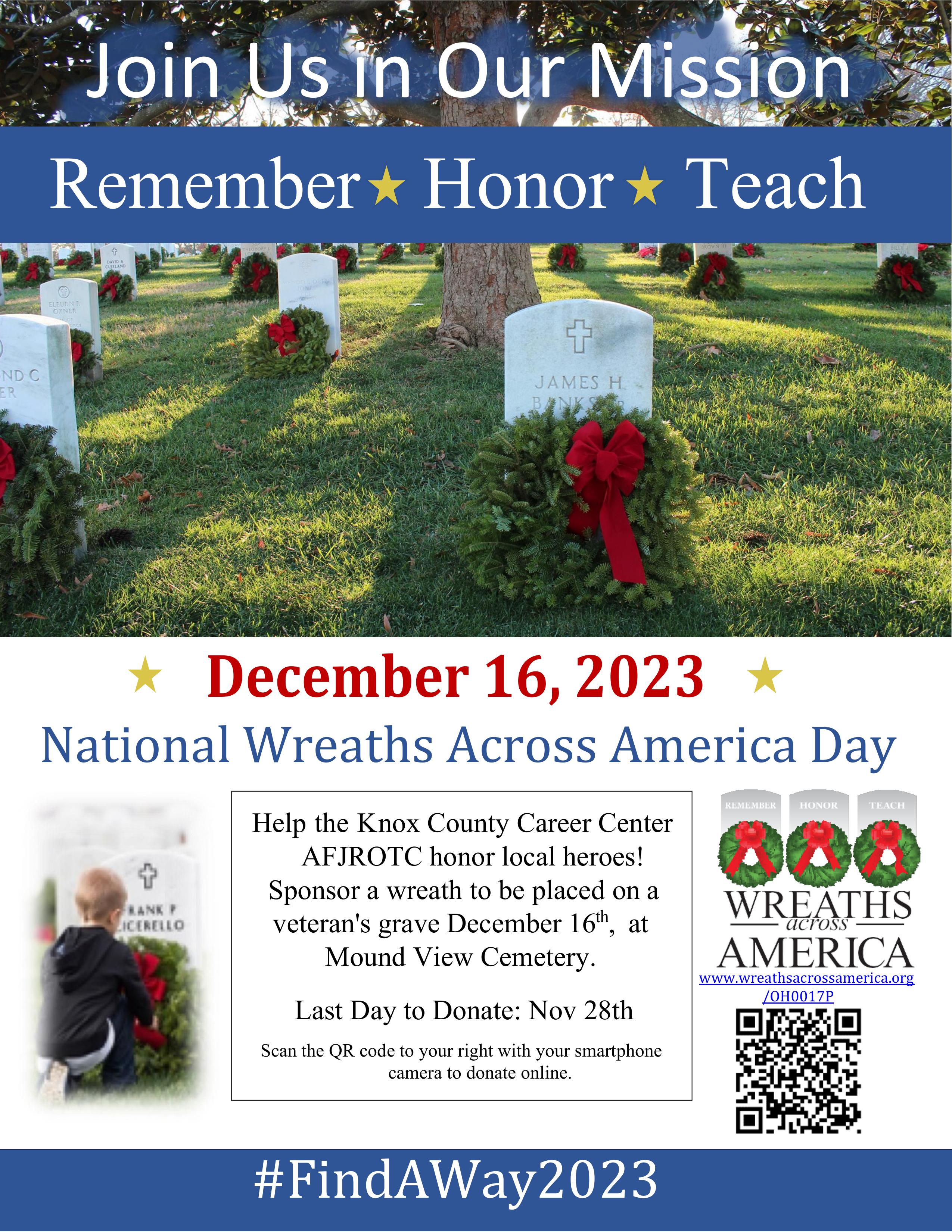 The Knox County Career Center and AFJROTC will be placing wreaths on graves at Mound View Cemetery on December 16th. You can scan the QR code on the post below to donate.
