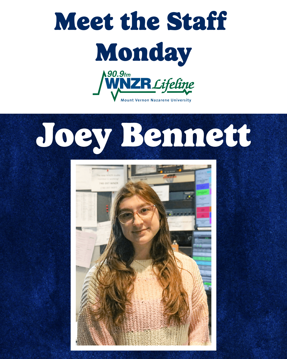 Joey Bennett is bringing energy, enthusiasm, and heart to the WNZR radio team this year. A freshman Communication and Digital Media major at Mount Vernon Nazarene University, Joey is already making her mark as a DJ. You can catch her live on WNZR every Wednesday from 2–4 PM, where she shares great music and an uplifting presence with listeners.