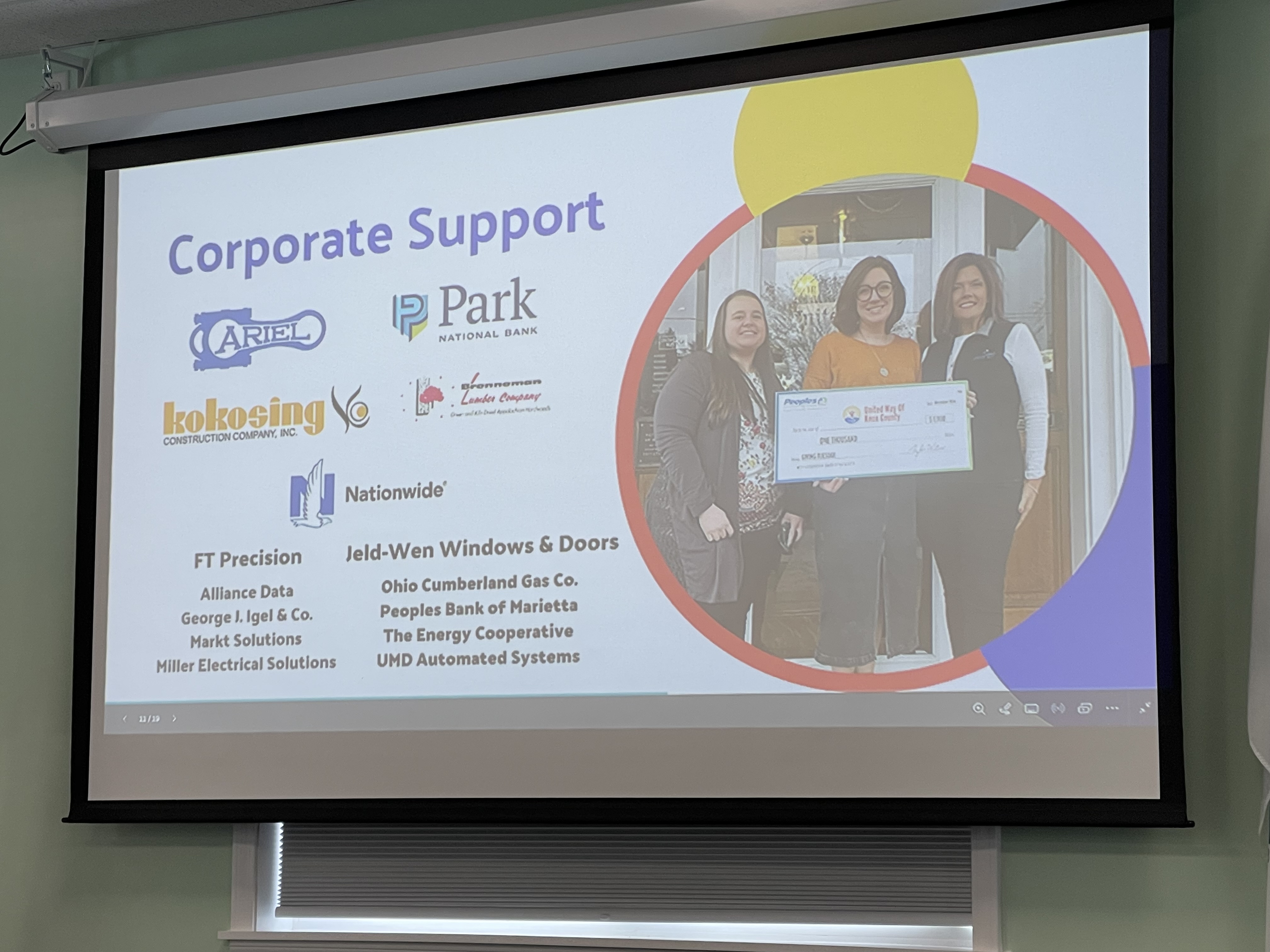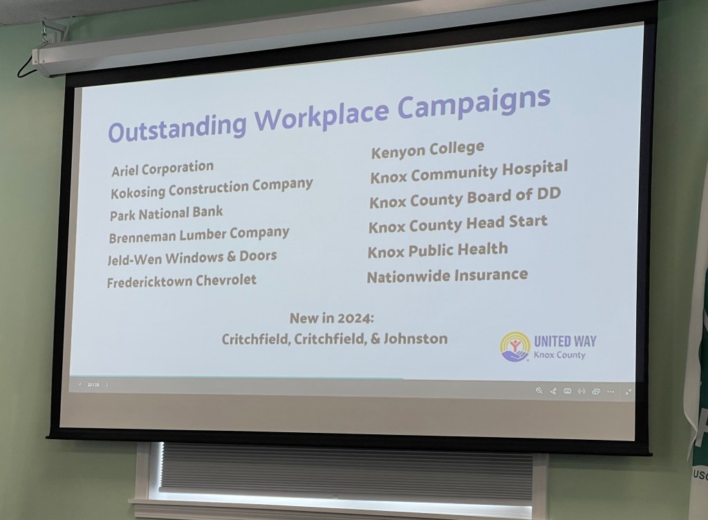 Ellis emphasized that United Way’s impact is truly a community effort. Local businesses, organizations, and volunteers all play a role—from major contributors like Ariel Corporation, Park National Bank, and Kokosing Construction to institutions like Kenyon College and Knox Community Hospital.