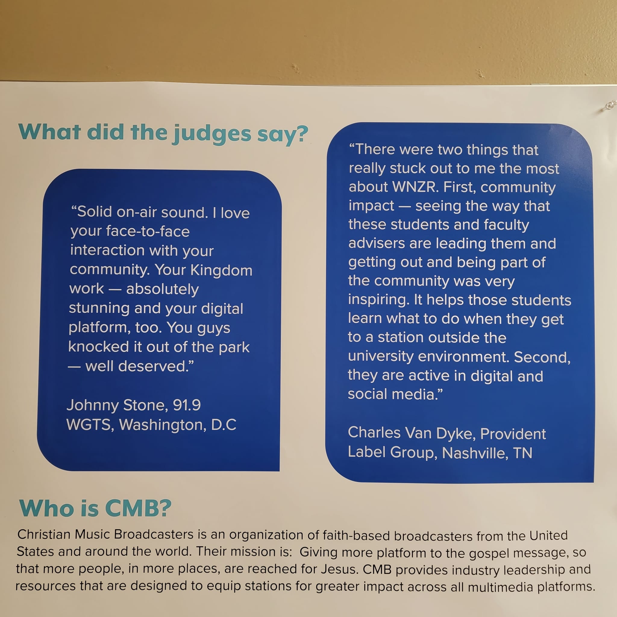 Even though Mike says he wasn’t heavily involved in the official CMB entry for Station of the Year, he clearly remembers the energy surrounding it. His classmates poured themselves into the project, working together to tell the story of WNZR. Being there to accept the award was a meaningful moment, not just because of the recognition, but because it represented the collective effort of students and faculty. For Mike, events like Momentum go beyond radio—they’re about building connections across the entire Christian media landscape.