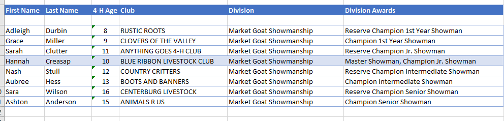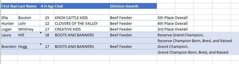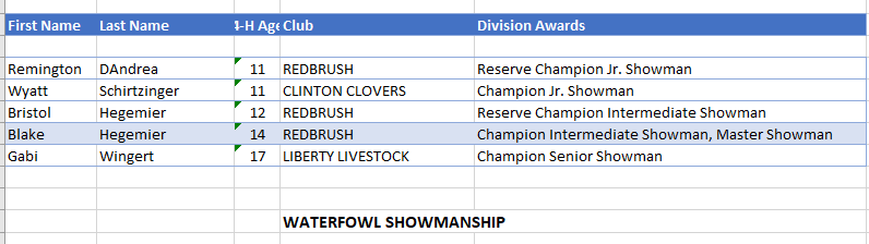 - The Grand Champion hog was shown by Kinleigh Overholt of Fredericktown with the Blue Ribbon Livestock 4H Club. Kinleigh was also the Light-Heavy Weight Division Champion.