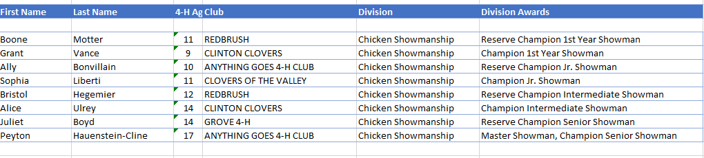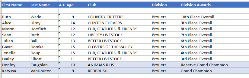 - The Reserve Champion broilers were shown by Henley Caughlan of Mount Vernon with the Animals R Us 4H Club.