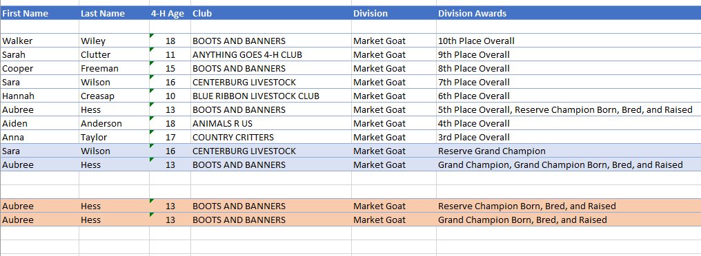 - The Grand Champion Market Goat was shown by Aubree Hess of Mount Vernon. She is part of the Boots and Banner 4H Club. Aubree was also the Intermediate Showmanship Winner.