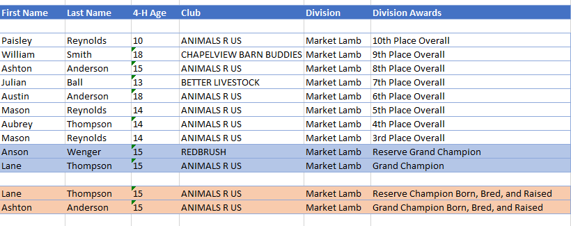- The Grand Champion Market Lamb was shown by Lane Thompson of Mount Vernon with the Animals R Us 4H Club. Lane was also Reserve Champion Bred, Born and Raised.