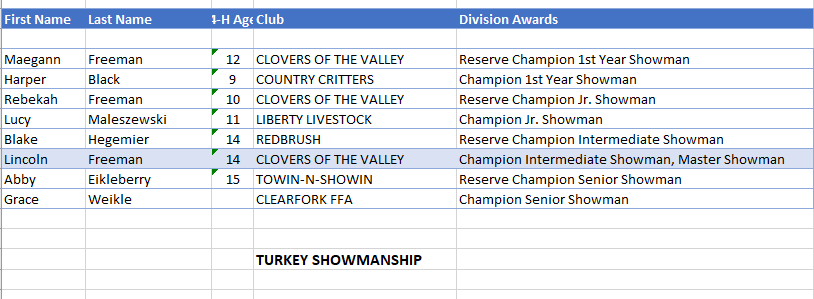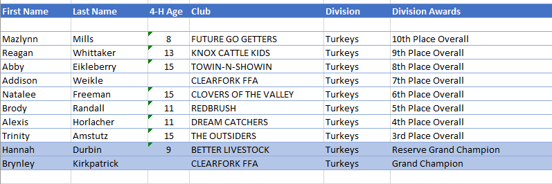 - The Grand Champion Turkey was shown by Brynley Kirkpatrick from Butler with the Clovers of the Valley 4H Club.
