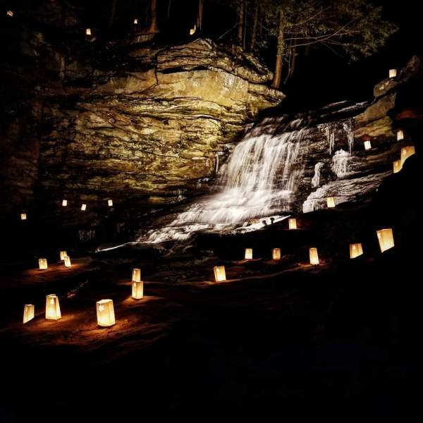 Over 600 luminaries will light your paths to Honey Run Waterfall and the Kokosing State Scenic River. Honey Run Waterfall is one of Knox County’s most spectacular natural gems and is absolutely mesmerizing with the hundreds of candle-lit snowflake bags. Please stay for holiday treats and enjoy a roaring bonfire! Be sure to bring a canned food item(s) for the Food For The Hungry drive. Deposit your food gift in one of the boxes provided. Last year patrons donated 115 lbs. of food and we hope to surpass that number this year. The Knox County Park District thanks you for your generosity to our neighbors and friends in need!