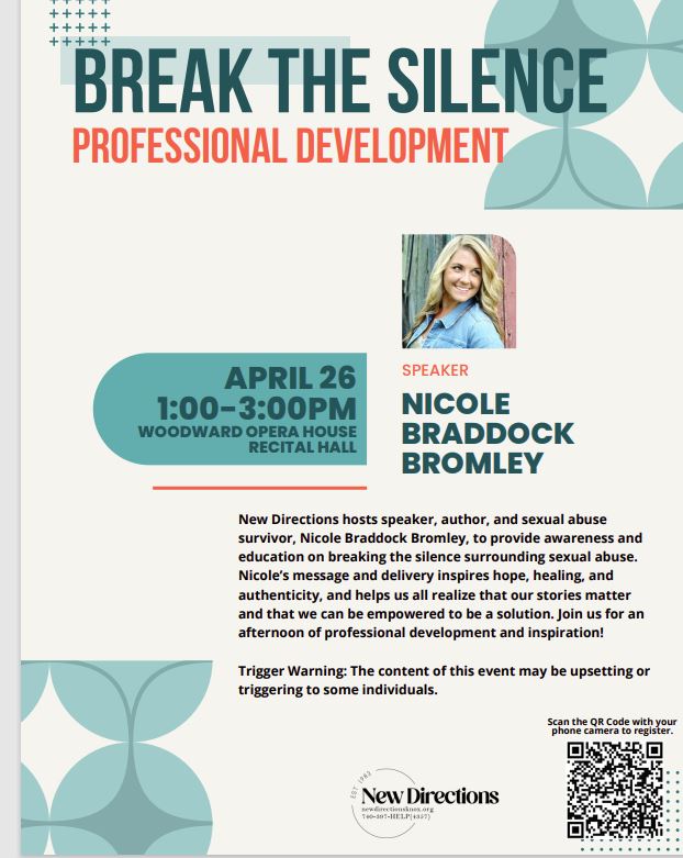 On Wednesday, 4/26 you will have two chances to hear from author, speaker and sexual abuse survivor, Nicole Braddock Bromley.